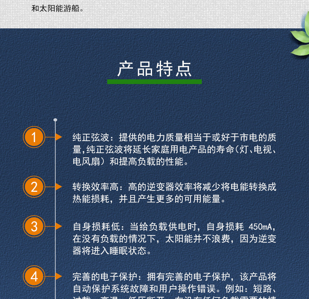● 完善的電子保護:擁有完善的電子保護,該產品將自動保護系統故障和用戶操作錯誤。例如:短路、過載、高溫、低壓斷開。在沒有任何負載需要的情況下會自動恢復;