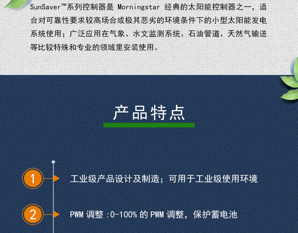 SunSaver?系列控制器是Morningstar經典的太陽能控制器之一,適合對可靠性要求較高場合或極其惡劣的環境條件下的小型太陽能發電系統使用;廣泛應用在氣象、水文監測系統、石油管道、天然氣輸送等比較特殊和專業的領域里安裝使用。