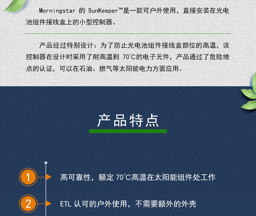 Morningstar的SunKeeper?是一款可戶外使用,直接安裝在光電池組件接線盒上的小型控制器。產品經過特別設計:為了防止光電池組件接線盒部位的高溫,該控制器在設計時采用了耐高溫到70℃的電子元件,產品通過了危險地點的認證,可以在石油、燃氣等太陽能電力方面應用。