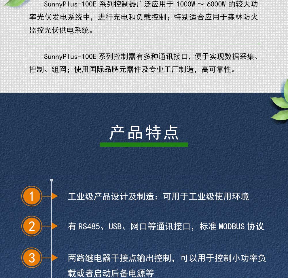 SunnyPlus-100E系列太陽能控制器廣泛應用于1000W~6000W的較大功率光伏發電系統中,進行充電和負載控制;特別適合應用于森林防火監控光伏供電系統。有多種通訊接口,便于實現數據采集、控制、組網;使用國際品牌元器件及專業工廠制造,高可靠性。