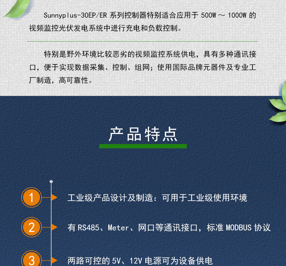 Sunnyplus-30EP/ER系列控制器特別適合應用于500W~1000W的視頻監控光伏發電系統,中,進行充電和負載控制。特別是野外環境比較惡劣的視頻監控系統供電,具有多種通訊接口,便于實現數據采集、控制、組網;使用國際品牌元器件及專業工廠制造,高可靠性。