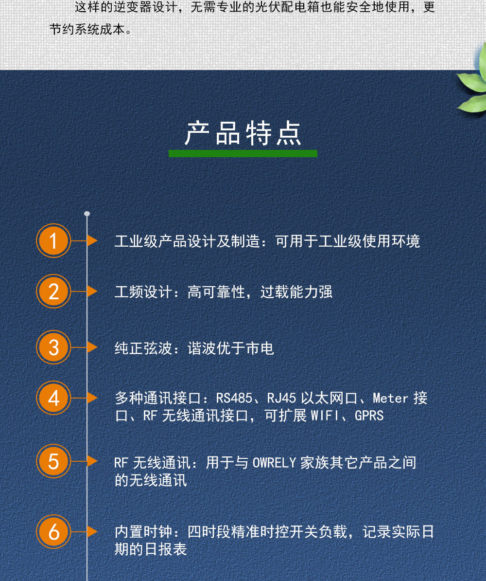 Owrely奧爾力逆變器是基于網絡通訊技術的智能終端型逆變器。秉承Owrely奧爾力產品設計的一貫性,精致的外觀和緊湊的結構設計,使太陽能獨立逆變器呈現出全新的感覺。這樣的逆變器設計,無需專業的光伏配電箱也能安全地使用,更節約系統成本。 |