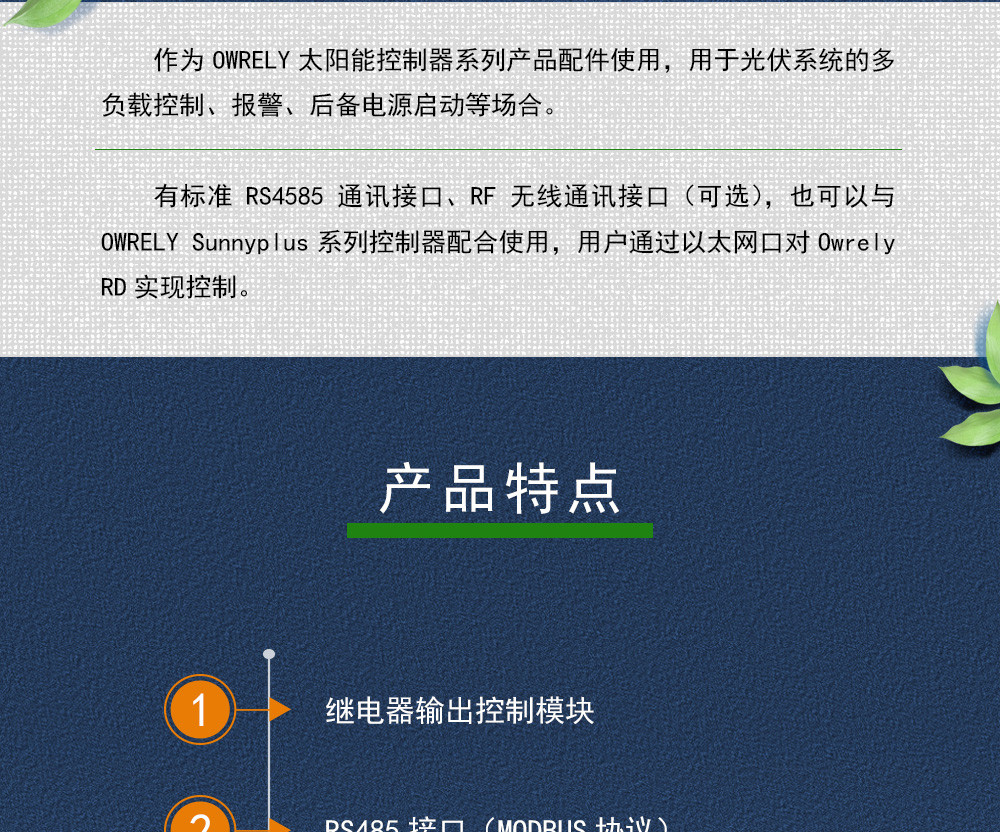 ?作為OWRELY太陽能控制器系列產品配件使用,用于光伏系統的多負載控制、報警、后備電源啟動等場合。有標準RS4585通訊接口、RF無線通訊接口(可選),也可以與OWRELY Sunnyplus系列控制器配合使用,用戶通過以太網口對Owrely RD實現控制。